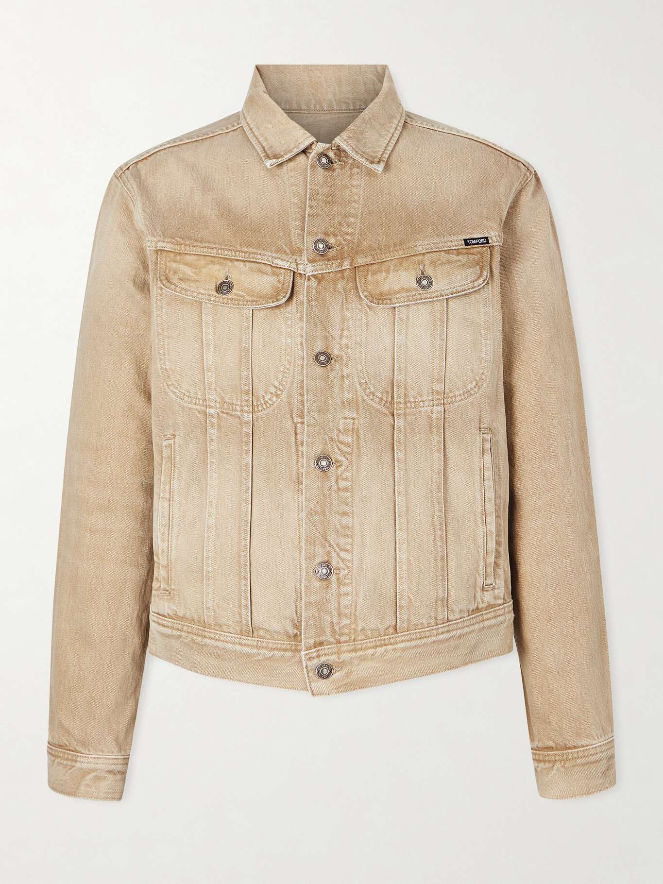 TOM FORD's denim jacket is lightly faded along the chest and waist for a lived-in finish. Note the discrete logo tag above the flap pocket.
