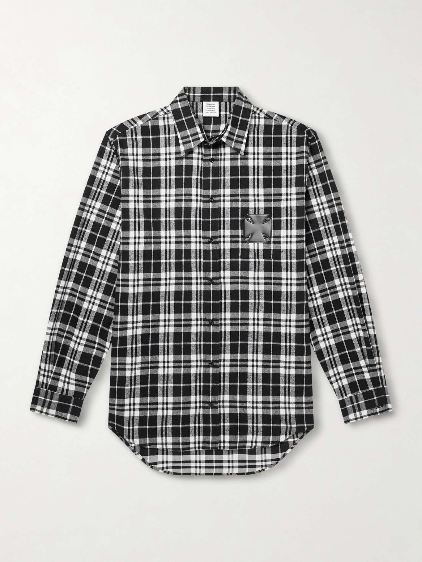 The leather cross appliqué on VETEMENTS' shirt is inspired by motorcycle clubs of the '60s. This cotton-flannel style patterned with classic checks and has a relaxed shape with a curved hem that's longer at the back.