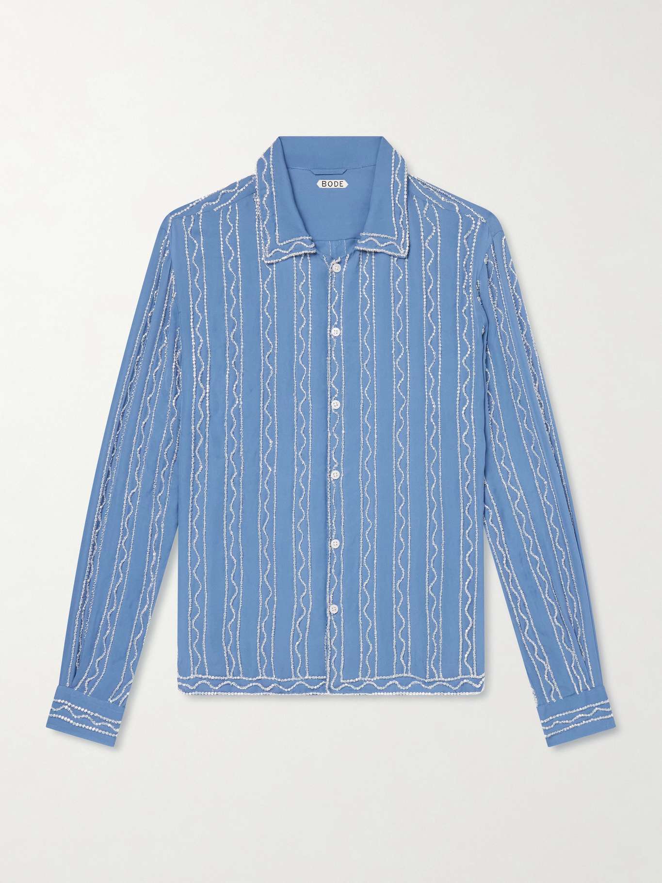 BODE’s shirt is traced with scores of beads arranged in a pattern reminiscent of rippling waves. It's made from soft silk in a light-blue hue and cut for a relaxed fit.