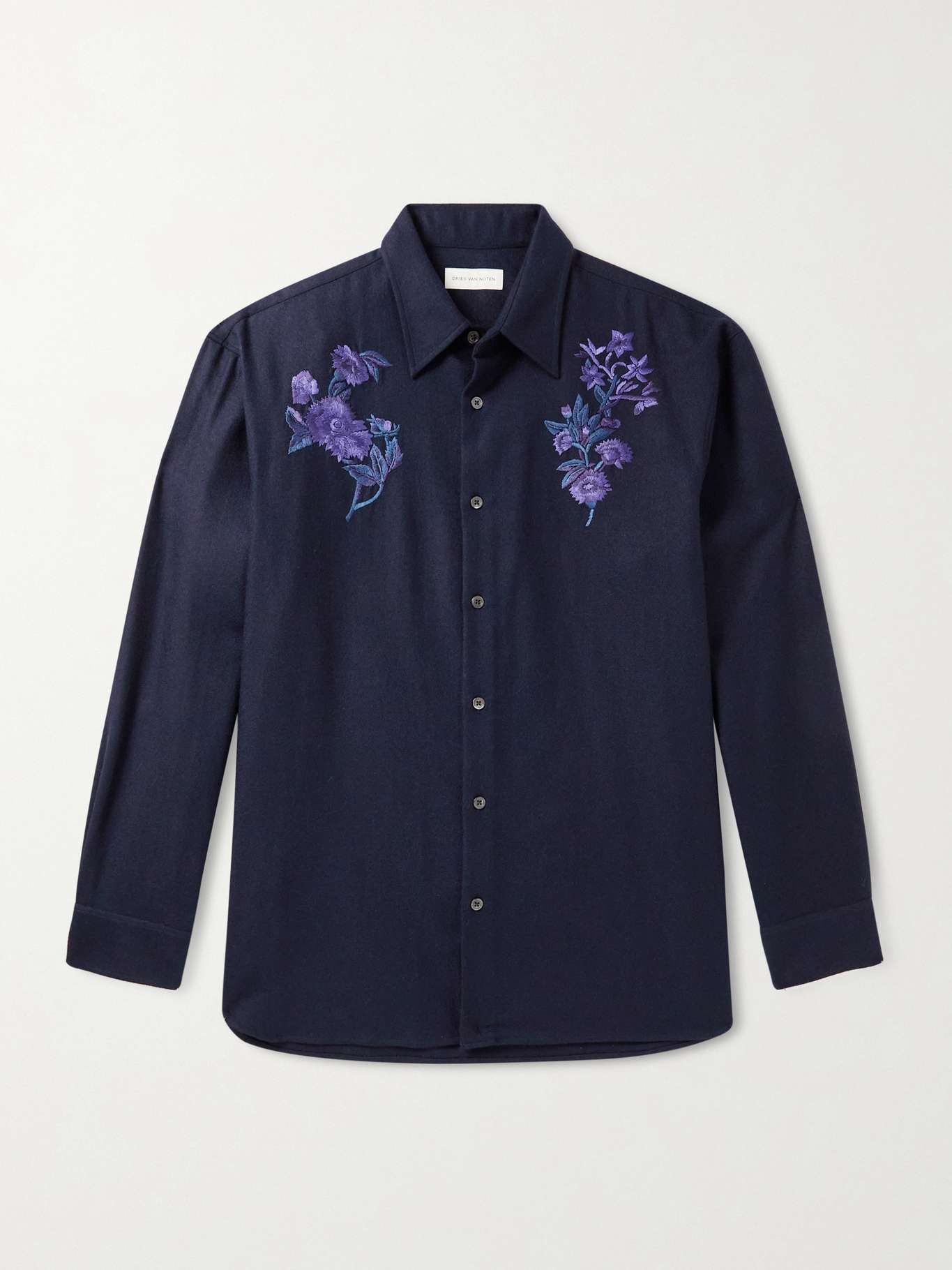 Dries Van Noten's shirt is embroidered with florals on either side of the chest. It's tailored from Scottish-woven wool-flannel in a rich navy and has elegant mother-of-pearl buttons along the placket.