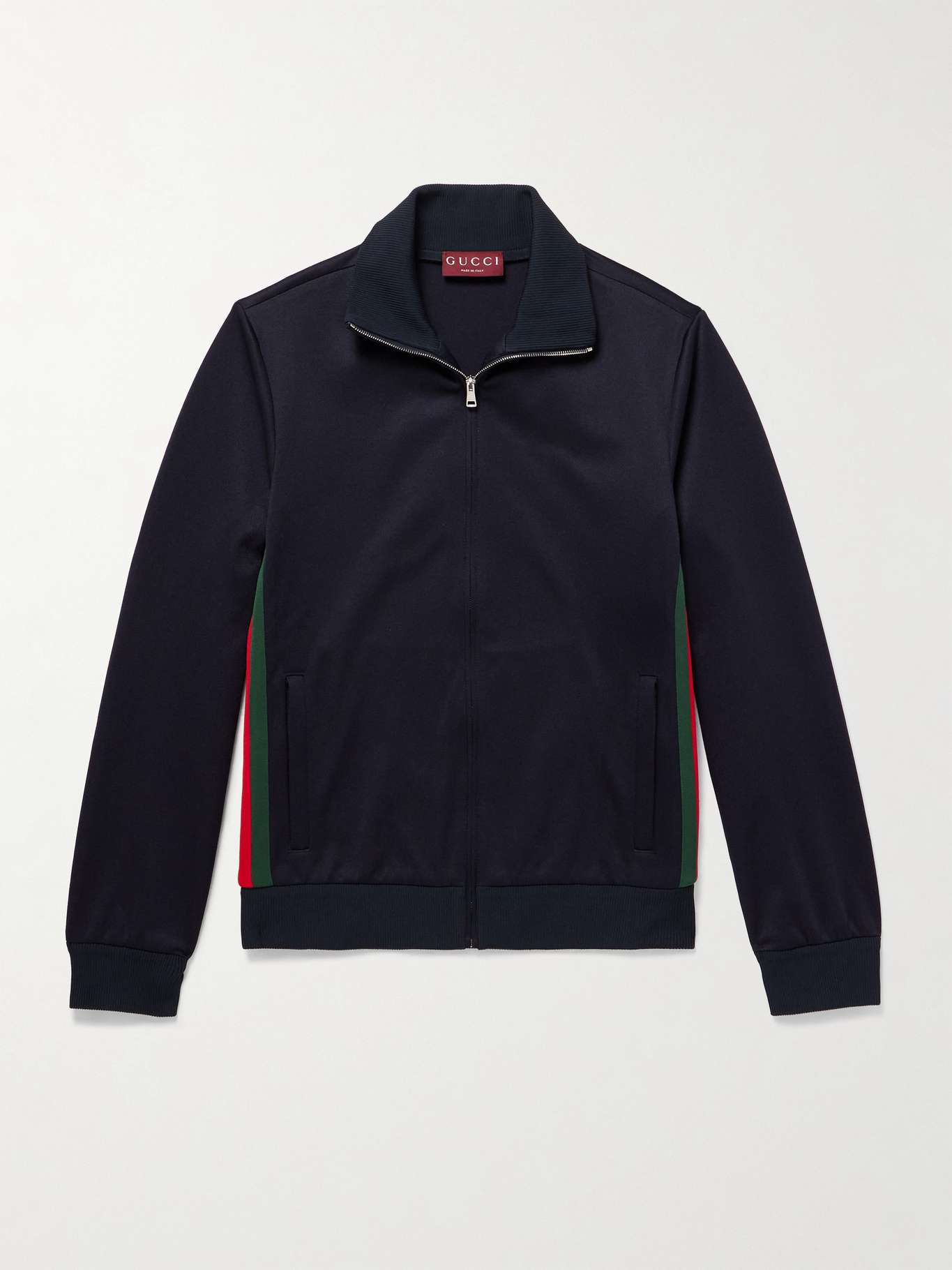 Gucci's track jacket draws inspiration from retro sportswear. It's been made in Italy from technical jersey with a full zip and striped webbing. Practical specs include a pair of front pockets and a stand collar for wind protection.