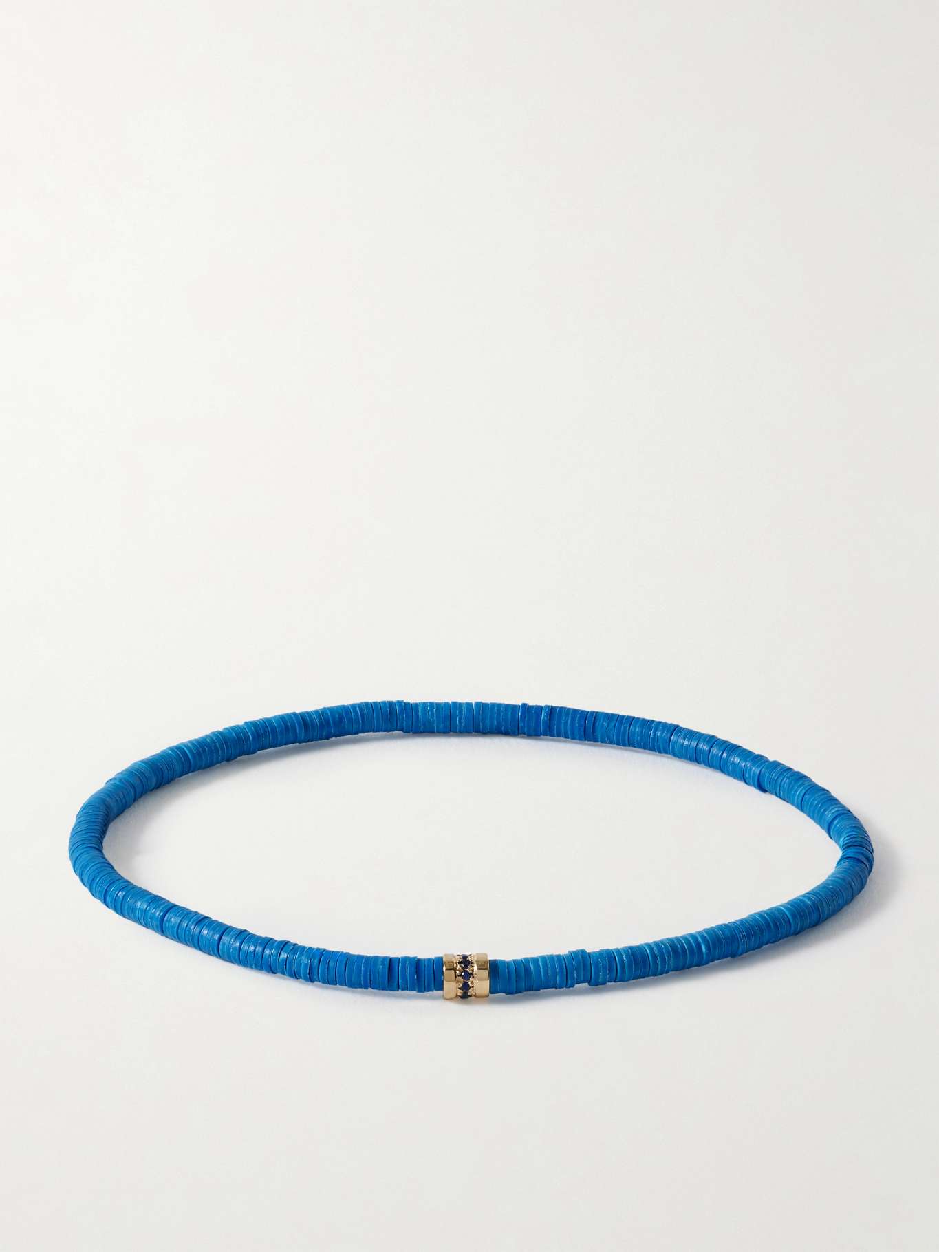 Luis Morais' bracelets are an easy way to personalise your everyday style. This version is strung with thin, disc-shaped beads and features a 14-karat gold charm set with a row of blue sapphires.