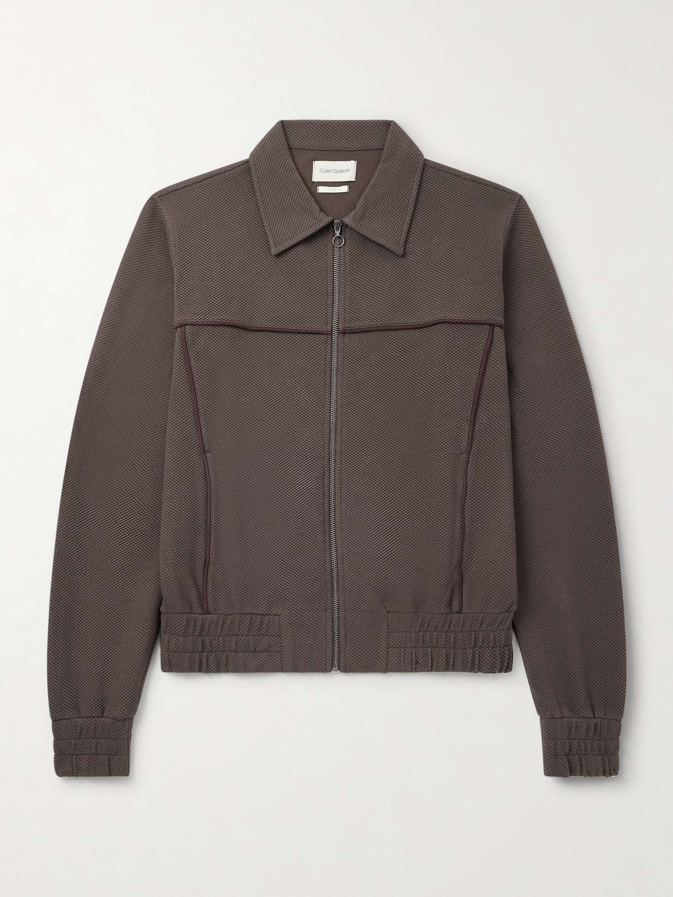An ode to classic athleticwear, Oliver Spencer's 'Harrison' jacket is knitted from a soft organic cotton-blend in a textural waffle stitch and traced with contrast piping. It has a point collar, a convenient zip-up front and elasticated hem and cuffs to neaten up the fit.