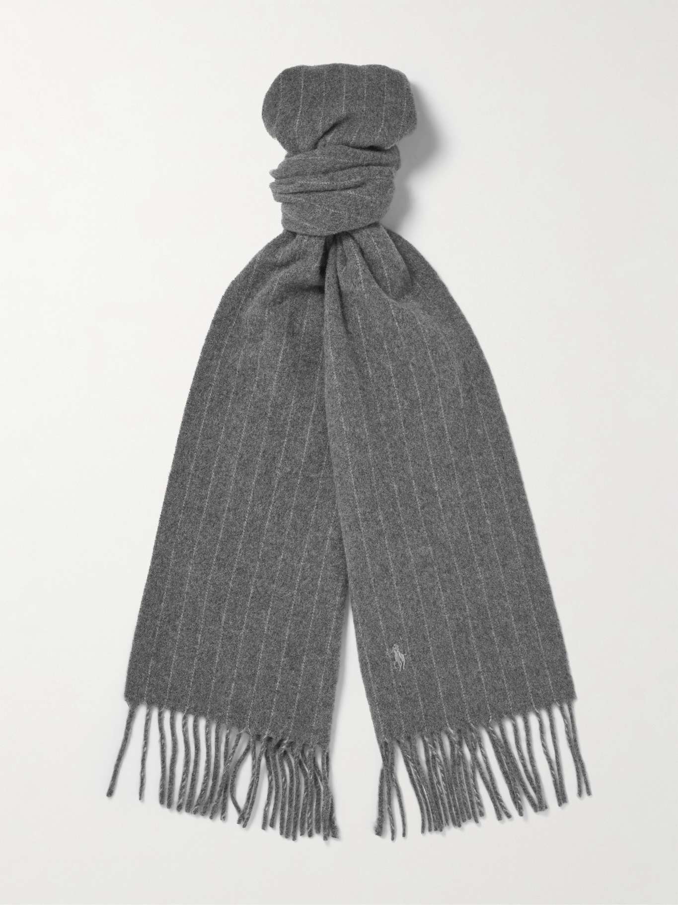 POLO RALPH LAUREN Logo-Embroidered Fringed Pinstriped Cashmere and Wool-Blend Scarf