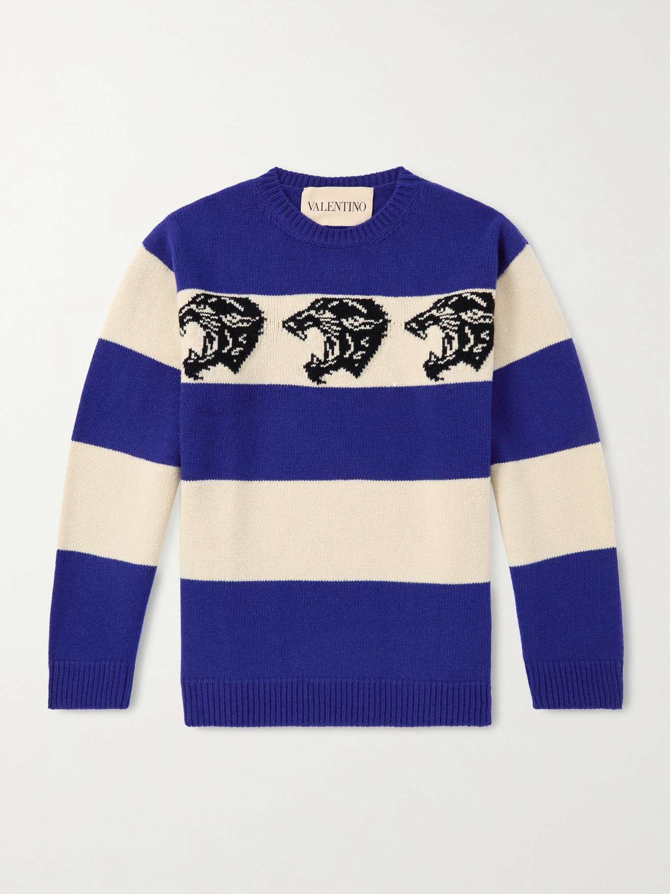 Valentino Garavani's sweater is decorated with a scroll of panther heads - a classical element in an otherwise modern design. It's jacquard-knitted from wool with bold blue-and-white stripes.