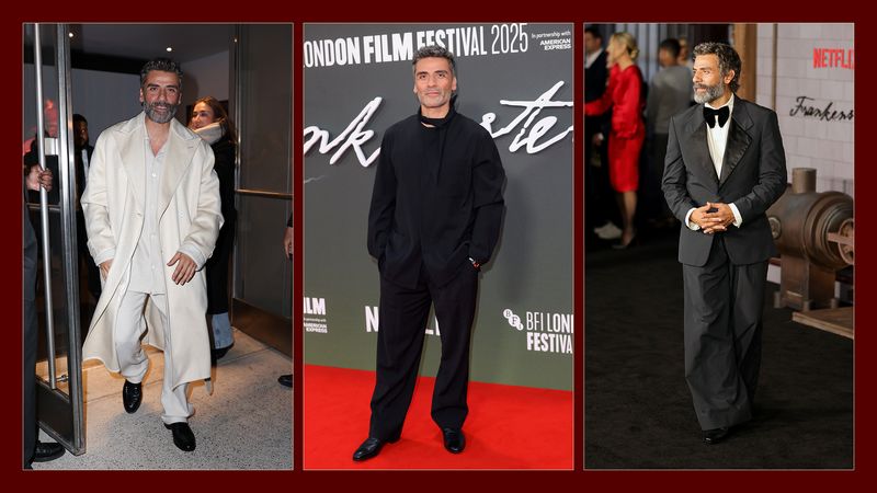 From left: Oscar Isaac in New York, 5 December 2025. Photograph by Jason Howard/Bauer-Griffin/Getty Images. At the London Film Festival, 13 October 2025. Photograph by Karwai Tang/WireImage/Getty Images. At the Los Angeles premiere of Frankenstein, 6 October 2025. Photography by Savion Washington/FilmMagic/Getty Images