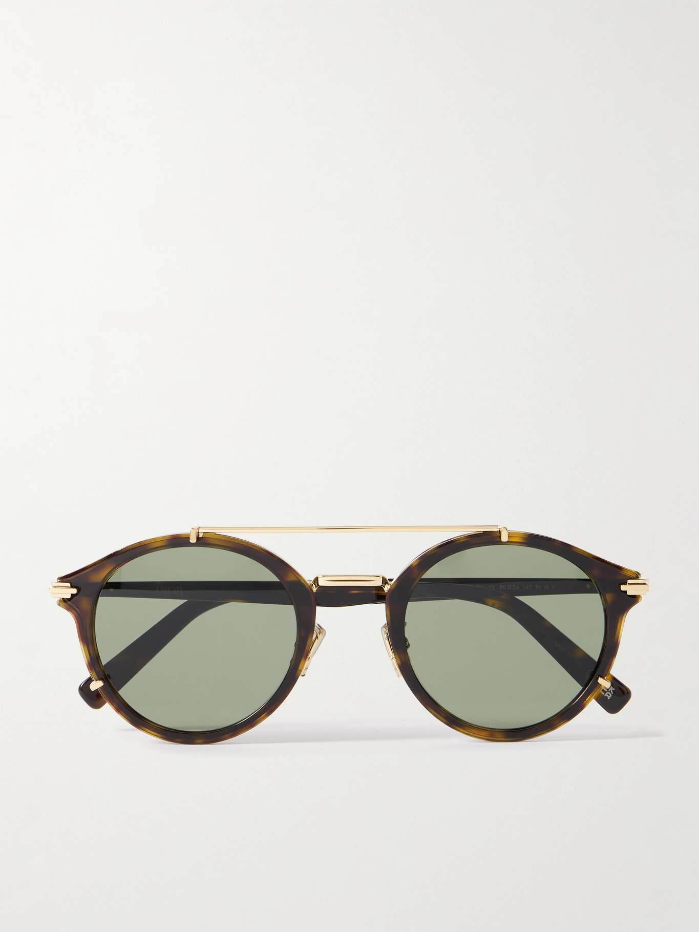 Dior Eyewear's 'DiorBlacksuit R7U' sunglasses are made from tortoiseshell acetate, an average of 65% of which is sourced from biodegradable materials. Designed in a classic round shape, they have a prominent gold-tone brow bar and logo-engraved hinges, which are inspired by the stitches from the label's suits.