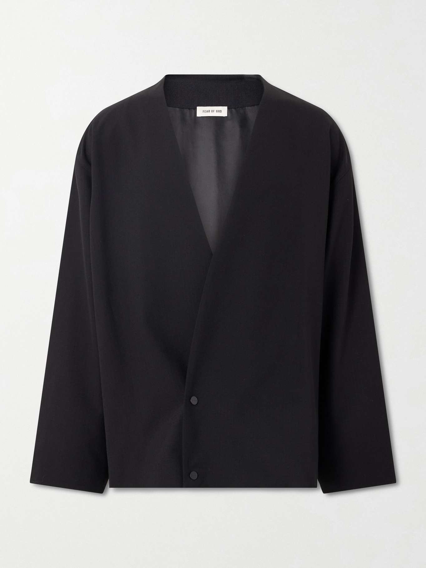 Cut from virgin wool, this double-breasted blazer by Fear of God is tailored in a fluid silhouette. The lapelless front creates a clean, uninterrupted line, while the button fastening gives the softly structured fabric an architectural ease.