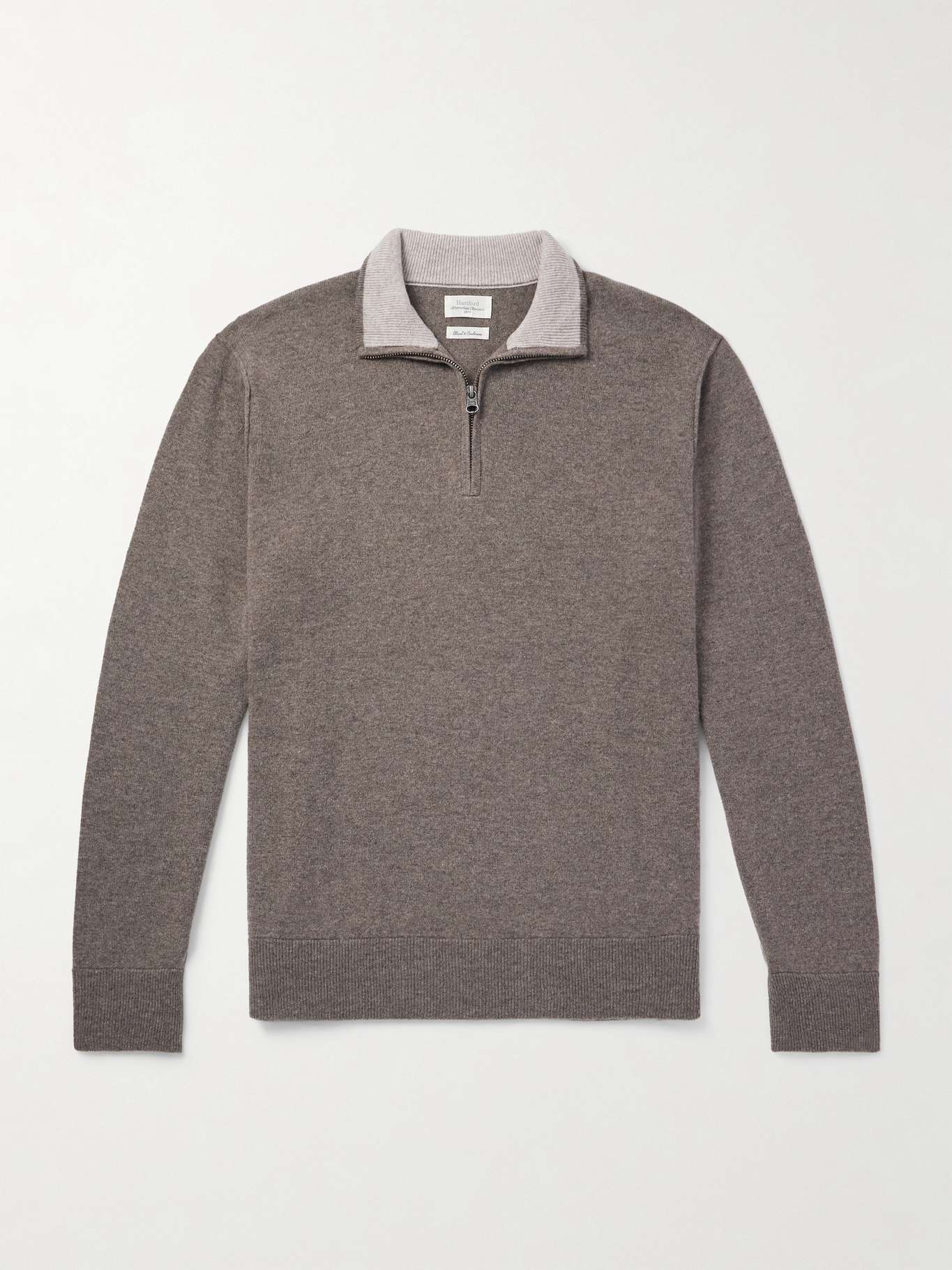 Hartford's half-zip sweater features beige along the inner collar, creating a retro two-tone look. It's made from a soft wool and cashmere-blend and has fully fashioned armhole seams with visible linking, highlighting old-school knitting techniques.