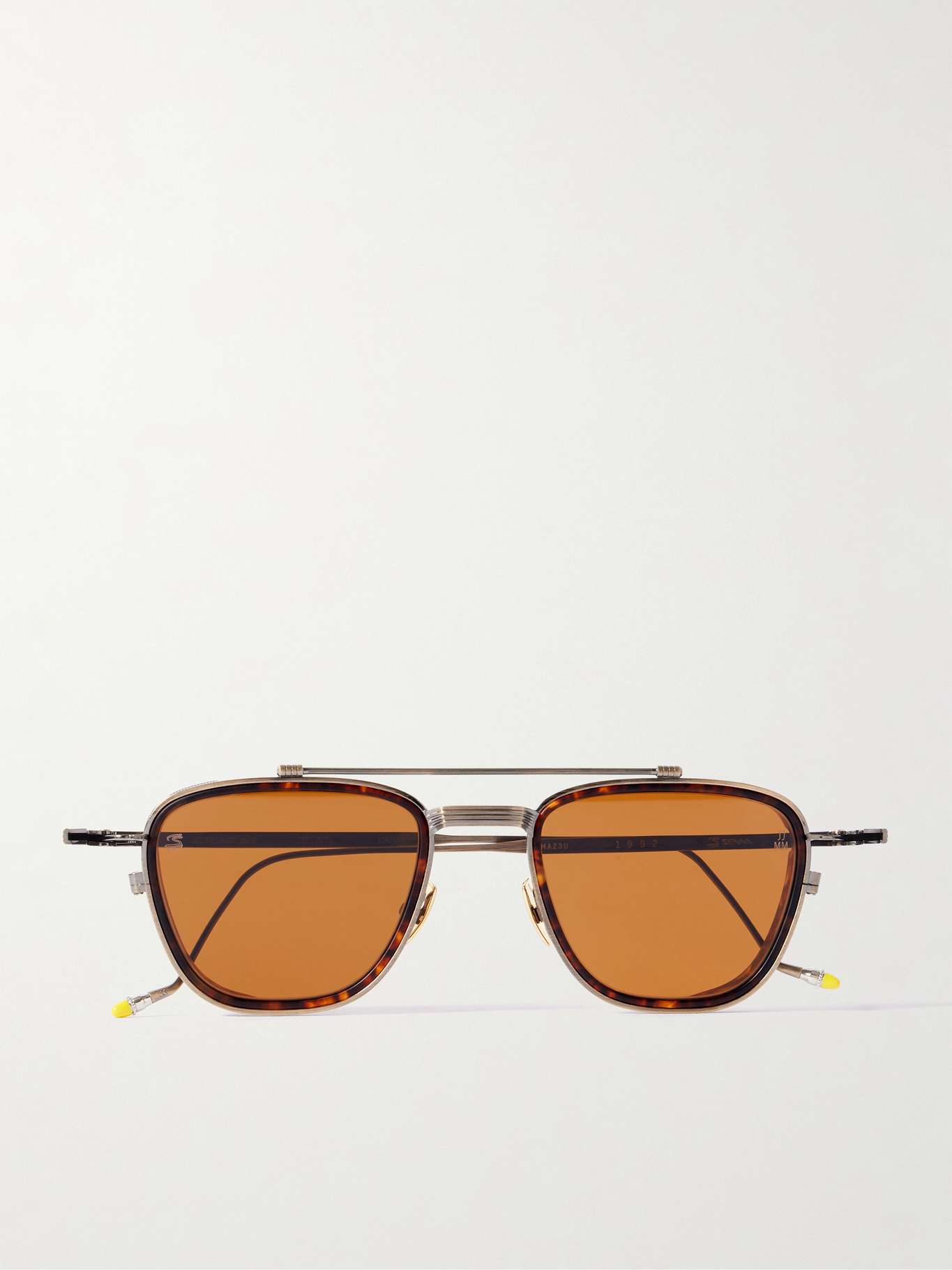 Jacques Marie Mage's limited-edition D-frame sunglasses are inspired by styles worn by Formula 1 driver Ayrton Senna and named after the year he won his fifth Monaco Grand Prix. Meticulously crafted in Japan from robust beta titanium, they feature a sculptural double bridge and tortoiseshell acetate inserts around the brown lenses. Note the contrast polished nose pads and hand-painted temple tips.