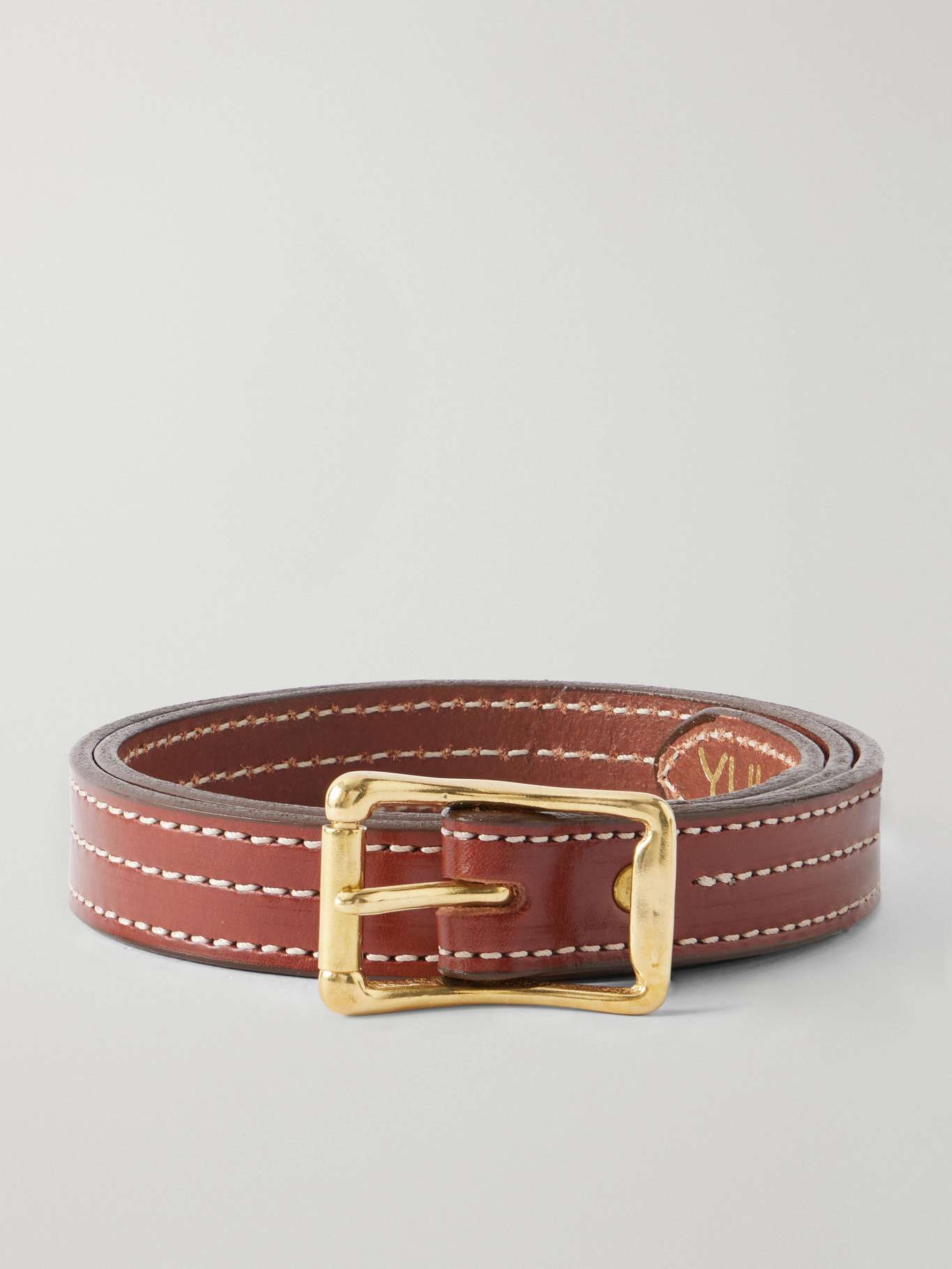 Yuketen’s belt is handcrafted in the USA from leather that will develop character over time. It’s fitted with a polished gold-tone buckle and finished with contrast stitching.