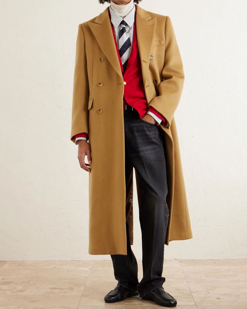 The same is true of the overcoat, the most dramatic garment in menswear. Back when men’s dress was governed by time, place and occasion (TPO), certain overcoats were made to be worn over dark worsted suits when men were doing business in London, while others were designed to be teamed with Shetland knits and tweed sport coats for sporting in the blustery countryside of Scotland. Out of these emerged specific details, such as collars that could be turned up against the wind or pockets that could keep frigid hands warm.