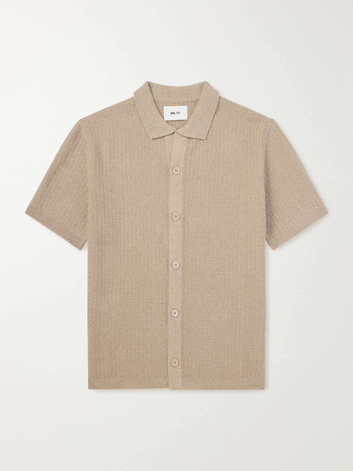 Knitted from medium-weight organic cotton, NN07’s ‘Ares 60019’ shirt is shaped with a relaxed camp collar. The soft, textured stitch adds subtle depth, while the buttoned front keeps the silhouette neat and easy to layer.