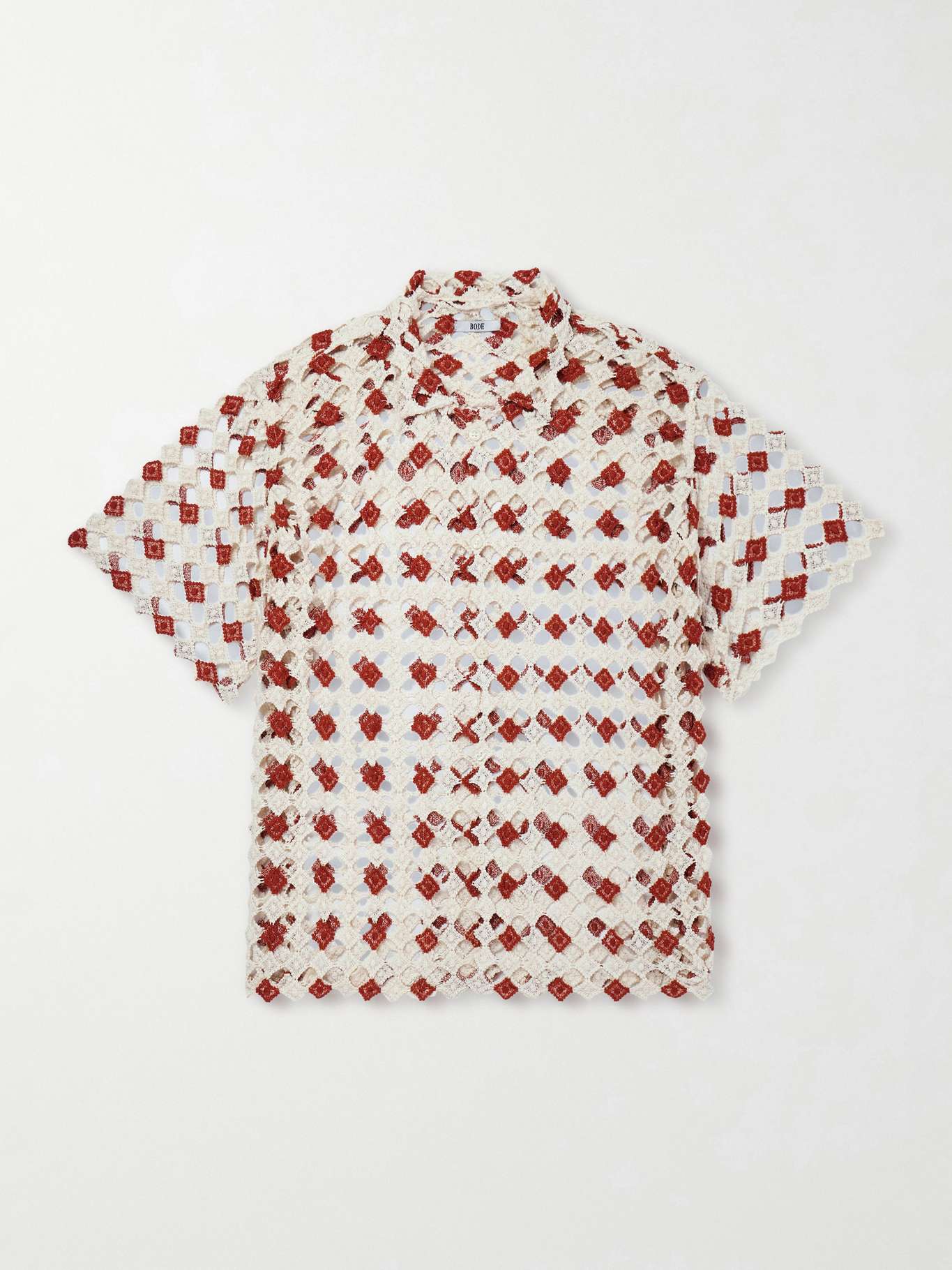 BODE’s shirt reflects the label’s interest in heritage textiles and handcrafted detail. Cut from cotton-lace in a diamond pattern, it has a lightweight, open texture that defines the short-sleeved silhouette.