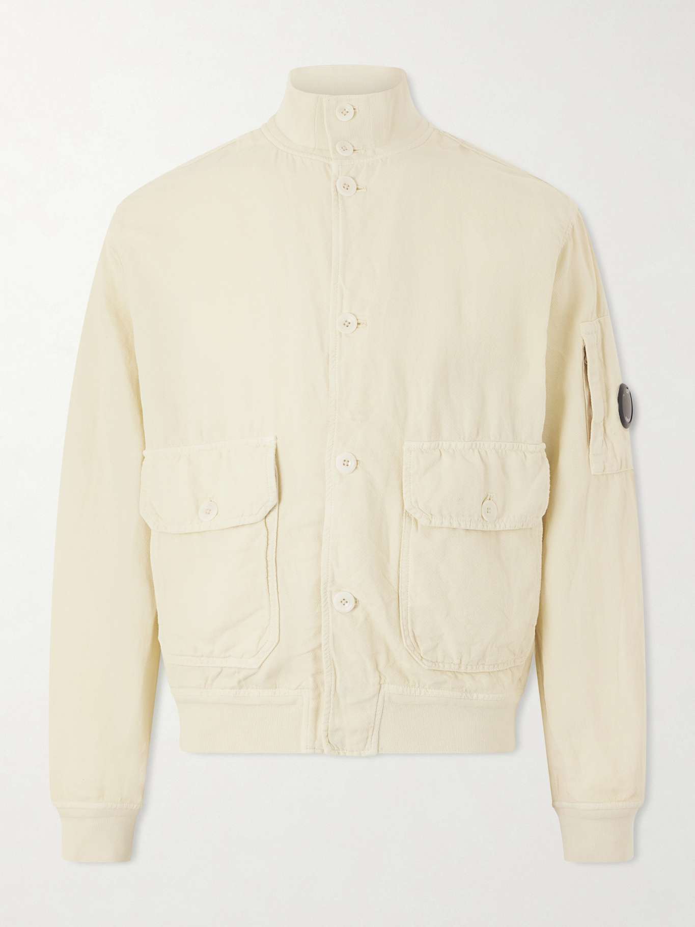 C.P. Company's jacket has a utilitarian allure, featuring two flap patch pockets at the front and a zippered pocket on the sleeve. The ribbed collar buttons up to the neck, while the softly structured construction—cut from a linen and cotton-blend twill in a regular fit—offers ease and mid-weight layering.