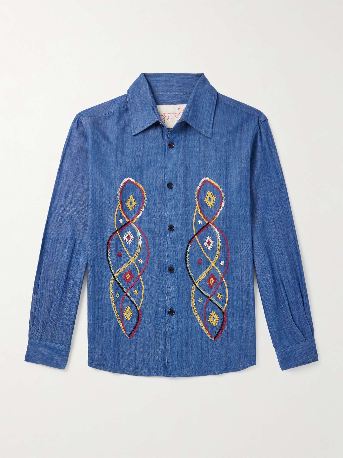 Kardo's 'Luis' shirt has been made from start to finish by one tailor, from naturally-dyed khadi cotton-chambray. It's cut for a relaxed fit and has a pointed collar, pleated cuffs, Rabari embroidery and a U-shaped hem.