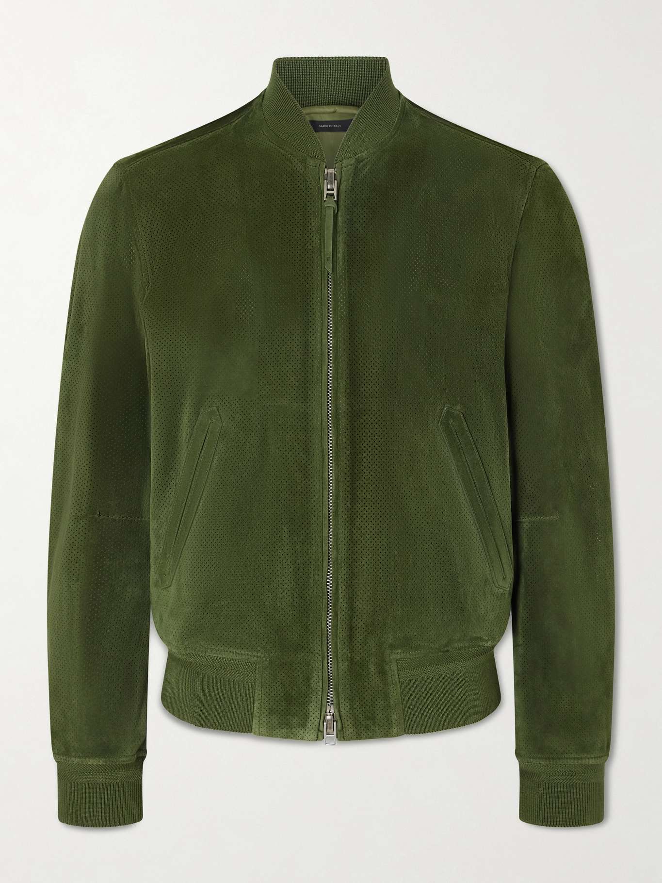 TOM FORD's bomber jacket was seen on its SS26 runway, thrown over a button-up. It's been made in Italy from perforated suede and dyed a dark-green shade that'll look great in low light.