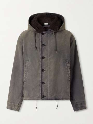 Fleece-Lined Distressed Cotton-Canvas Hooded Jacket