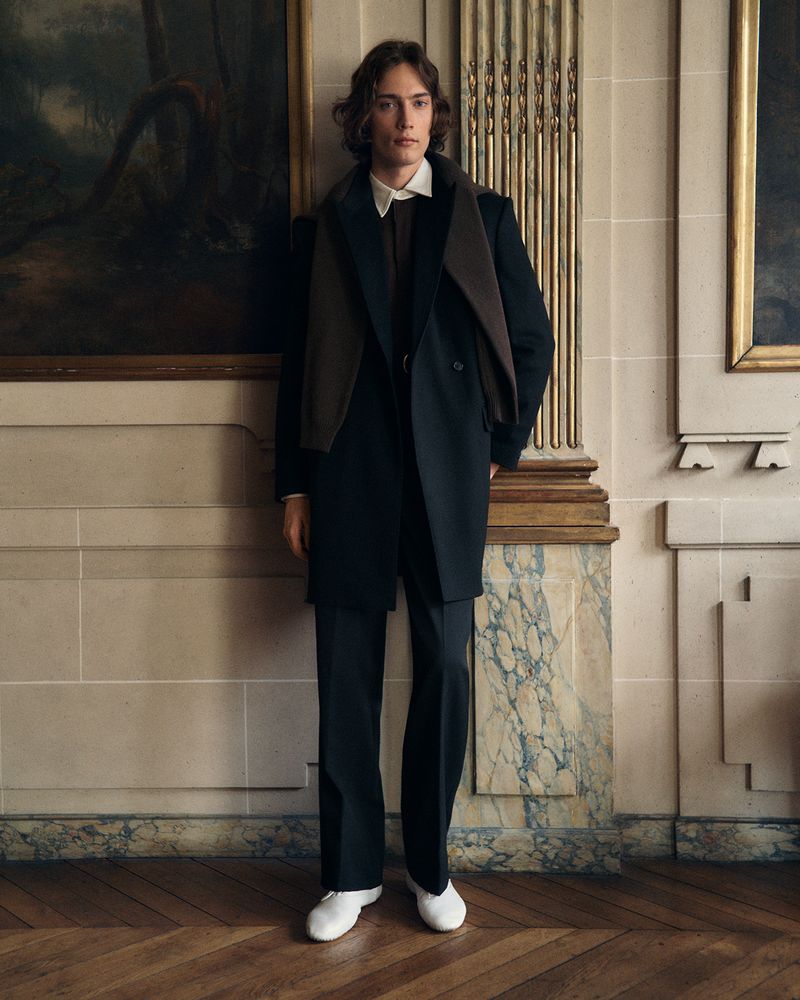 Coming soon: black wool double-breasted coat, brown polo shirt, black diagonal wool Jazz trousers, white lambskin lace-up shoes, all by CELINE