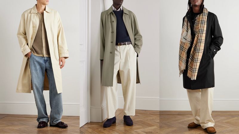 Macs can be made from any number of materials today, not just the rubberised cotton used two centuries ago. Something in a coated cotton, wool gabardine, or polyester shell will drape much more fluidly while offering similar protection. Wear it over suits, sport coats and thicker casualwear to fill out the space inside. Designed for rain rather than chill, the mac brings a cleaner, more metropolitan sensibility than its country-bred cousin, above.