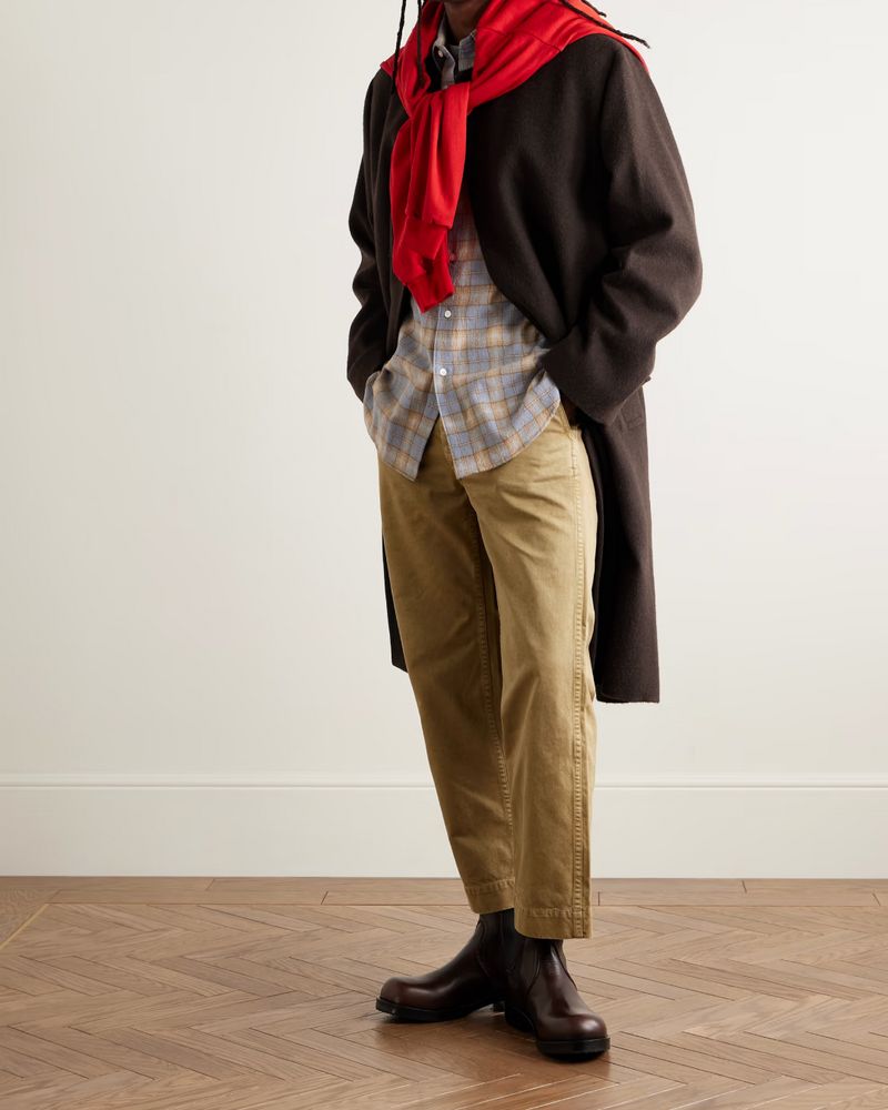 Consider a balmacaan if you want an overcoat that pairs easily with casualwear. The raglan-sleeve construction not only sheds water more effectively, but it also gives the coat a softer, more relaxed line through the shoulders. Worn loose and long enough to stir about the calves, it should fit comfortably over other garments since it doesn’t have a horizontal shoulder seam. It slips easily over chunky sweaters and even a mid-layer jacket – such as denim truckers or tweedy sport coats – when the weather turns especially cold.