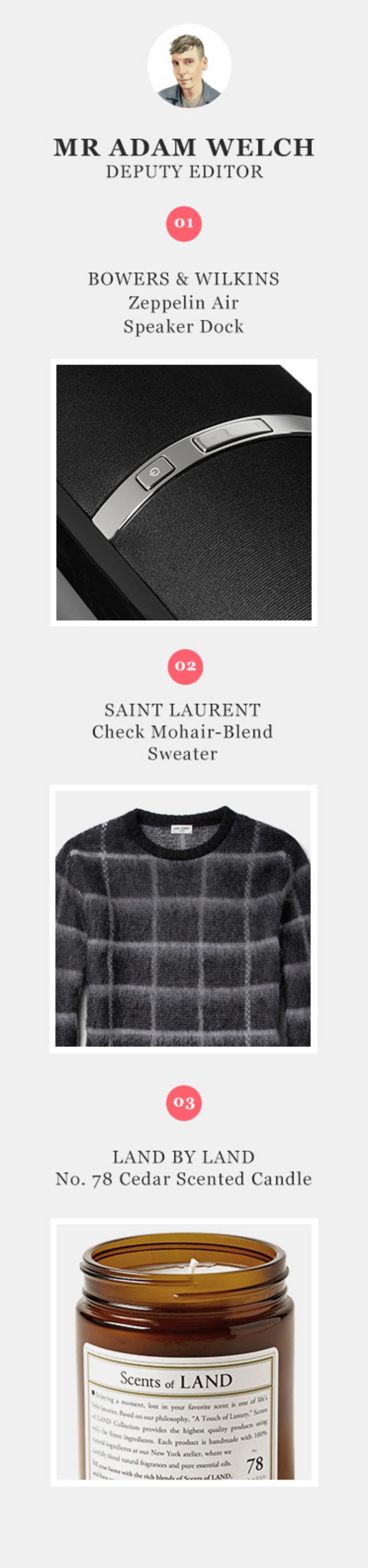 Most of the time I have a fairly-passive aggressive relationship with myself, so this Valentine’s Day I’ll be self-gifting some items to help lighten the mood. First up is a wireless speaker from Bang & Olufsen (with which to listen to sappy songs). Then I’ll light this cedar candle from Land by Land. And then give myself this Saint Laurent sweater. A sort of mohair hug, if you will. All in all that should be enough to bring a tear to my eye… “I really am so thoughtful,” I’ll think, as Ms Toni Braxton wails on in the background.