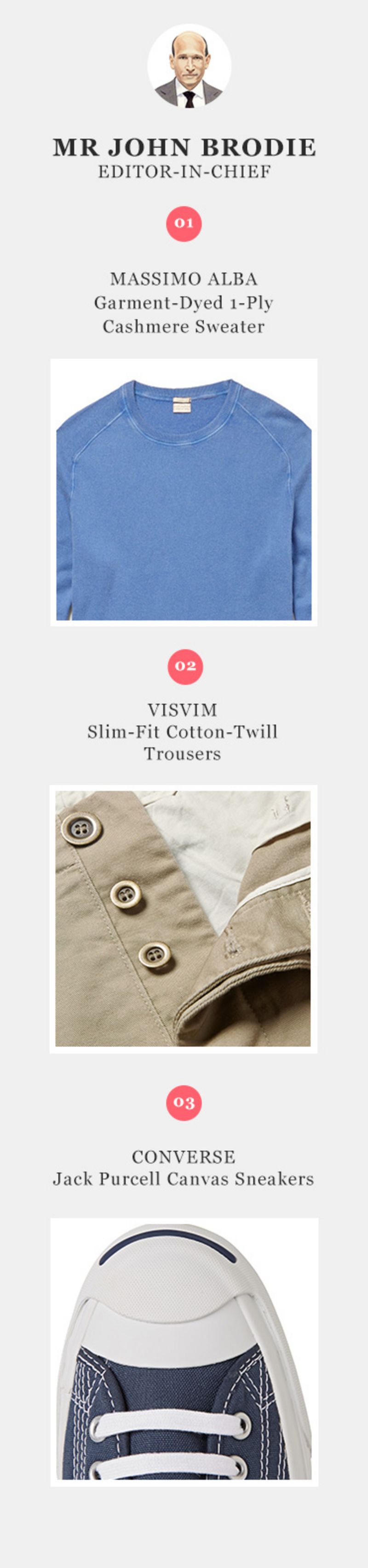 It seems less self-indulgent to pick one of Mr Massimo Alba’s garment-dyed, blue cashmere sweaters – only because the green one I already own has a habit of mysteriously migrating to my wife’s closet. Signor Alba’s knitwear feels as comfortable as a sweatshirt, but you look as if your G-5 is idling at Teterboro [airport]. This mogul-at-the-mall look could use a pair of visvim slim-fit cotton trousers and a pair of Jack Purcell’s. The sneakers, now a menswear classic, were initially designed for Mr Purcell’s sport of choice, ie, badminton, and one never knows when an errant shuttlecock may come your way. So I like to be prepared.
