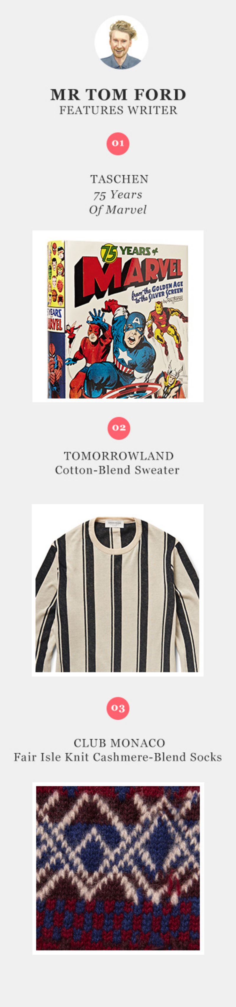This gargantuan tome covering 75 years of Marvel comics is not only big enough to keep me occupied while I sit out the whole hellish pageantry of Valentine’s Day, but also so vast you’d need to be the Incredible Hulk to pick it up in a hurry. (Some have suggested that it is precisely these sort of arrested adolescent insights that result in my spending Valentine’s Day alone and indoors.) While I’m reading comics, I’ll need something super-heroic and super-cosy to wear. This sweater and socks combo will keep me extra comfortable as I sit the night out.