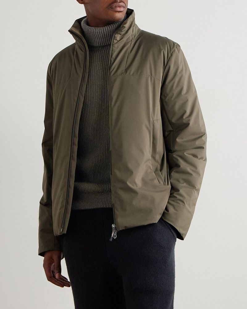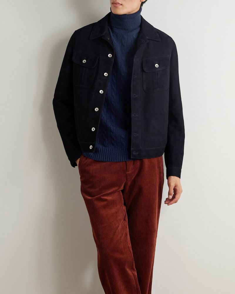 “I prefer [lightweight turtlenecks] specifically beneath a tailored jacket or suede blouson,” Browne says, the blouson being originally designed for fighter pilots.