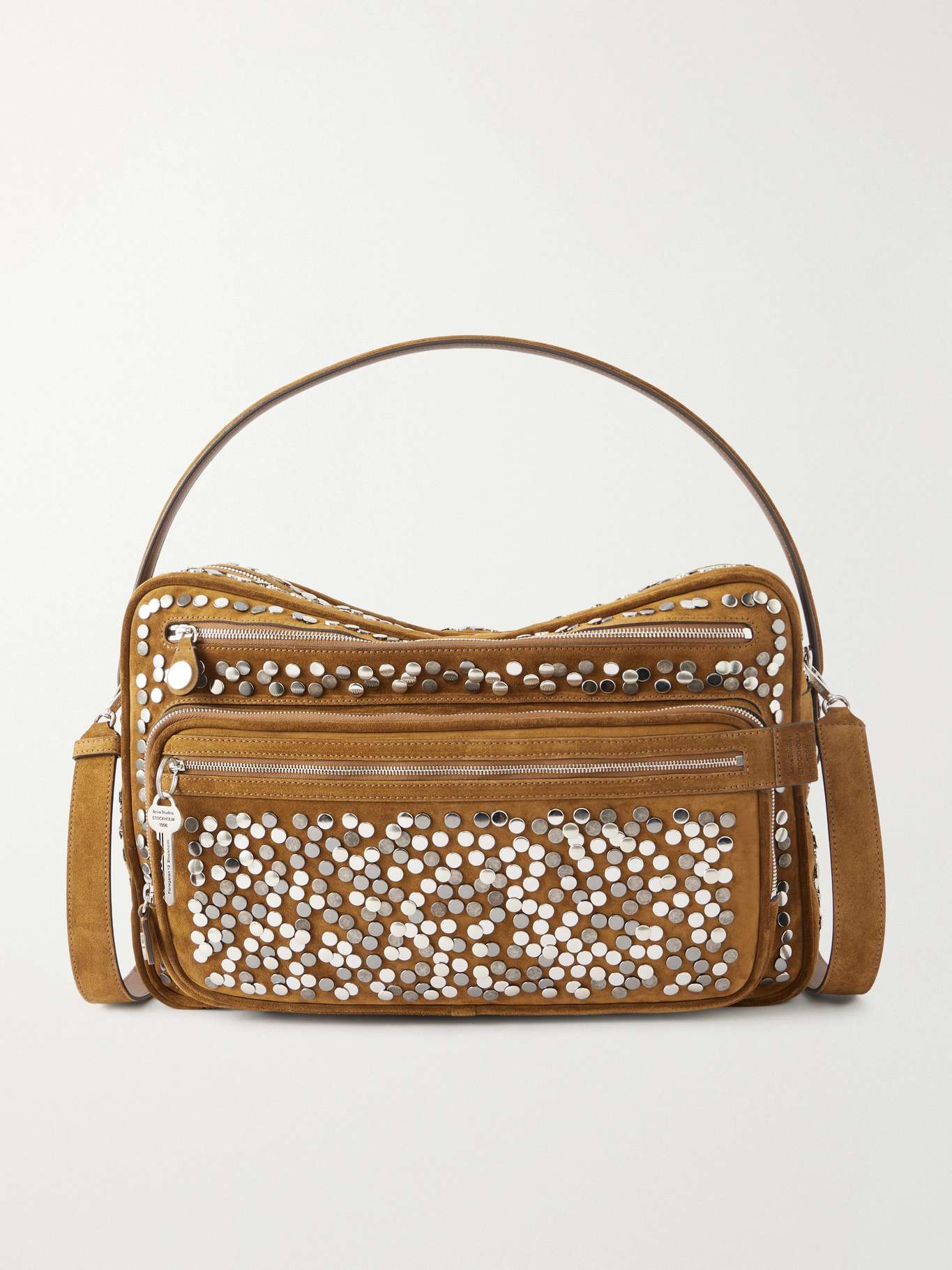 Cut from buttery-soft cognac suede and detailed with mixed-metal rivets, Acne Studios' 'Camero Camera' bag has multiple pockets and a branded key charm. A drop handle and adjustable crossbody strap allow it to be worn on the shoulder or across the body. Sized to hold daily essentials, including a laptop.