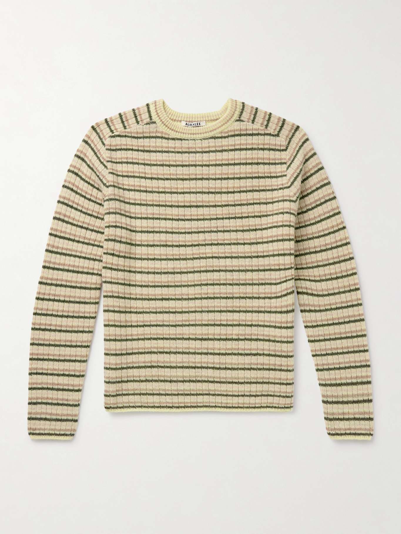 Auralee’s sweater has been knitted in Japan from a Shetland wool and cashmere-blend, which is prised for its lightweight warmth. It has a horizontal striped pattern and a contrasting vertical ribbed stitch.