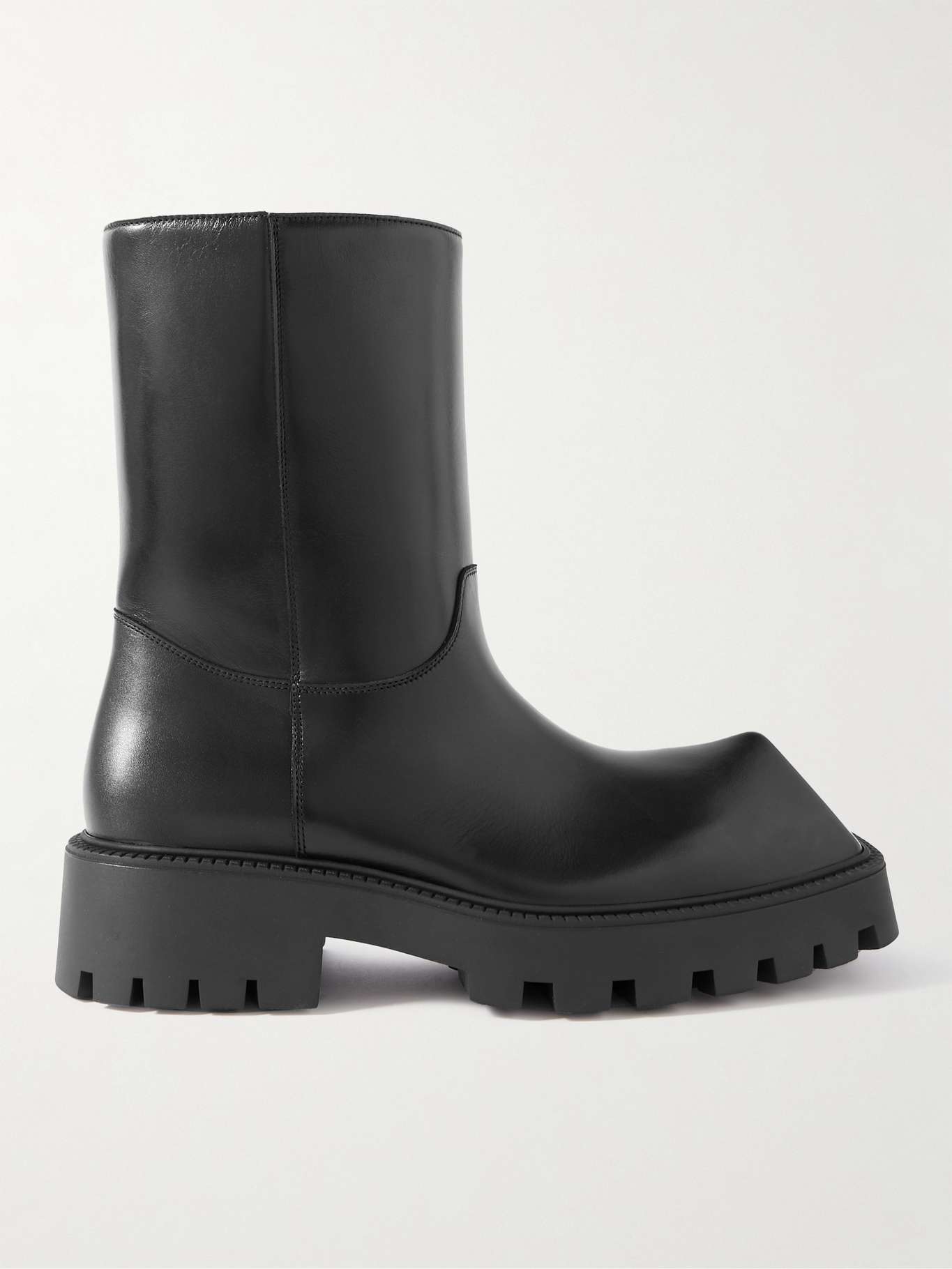 Balenciaga puts its signature oversized proportions on full display with these 'Rhino' boots. Designed with flattened front panels and stacked heels, they've been made in Italy from black leather and set on chunky rubber-lug soles.