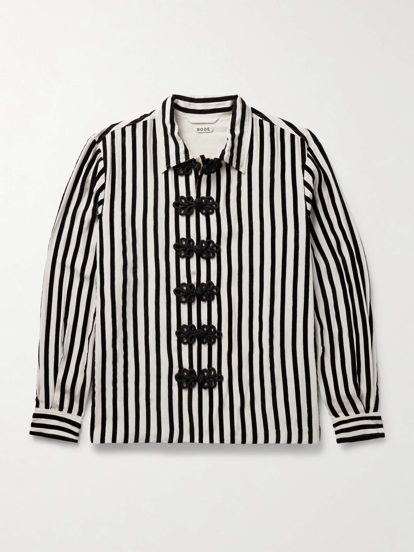 BODE Bannister Appliquéd Velvet-Trimmed Striped Silk Shirt