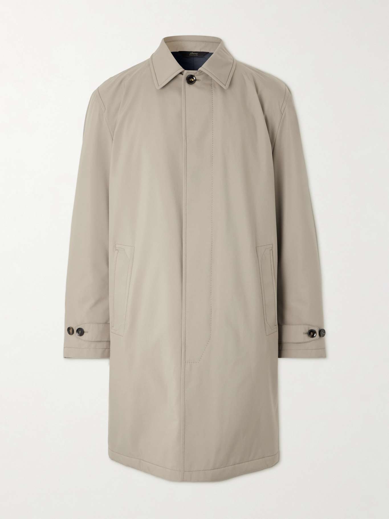 Since opening its first store in 1945, Italian label Brioni has become the go-to for sartorial ease and power dressing. This shell overcoat is cut for a relaxed fit and padded with a soft cashmere-blend for warmth. Wears yours with tailoring to the office.