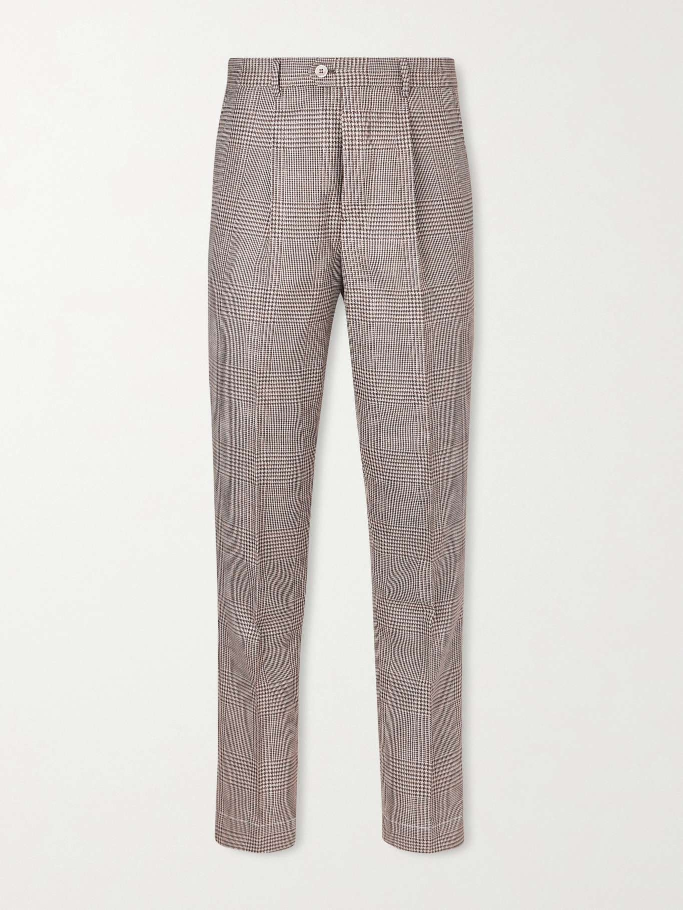 BRUNELLO CUCINELLI Straight-Leg Pleated Prince of Wales Checked Wool, Silk and Linen-Blend Trousers