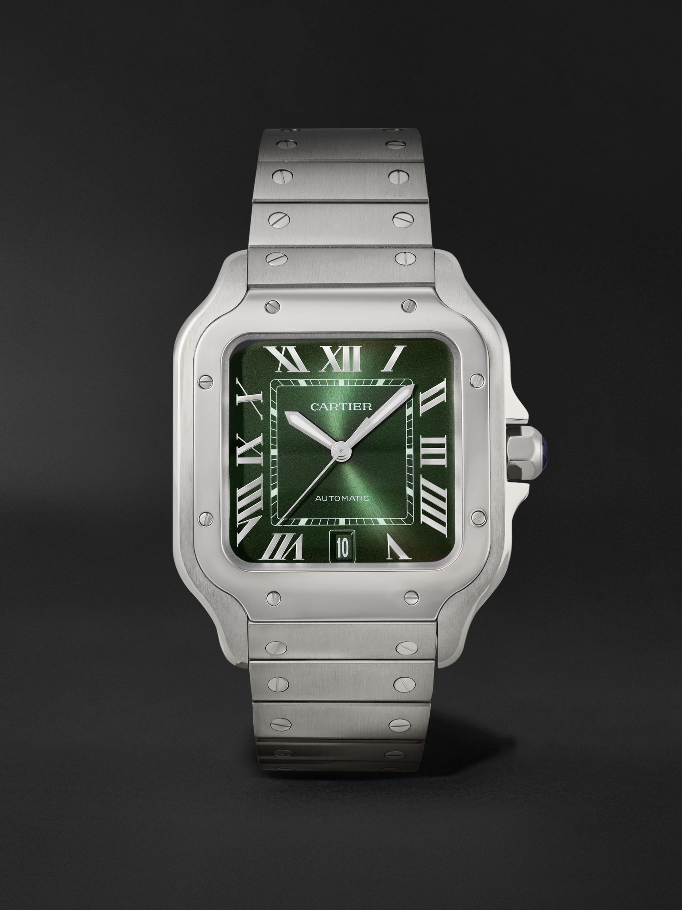 - Luminescent, stainless steel sword-shaped hands, polished steel Roman numerals and markers