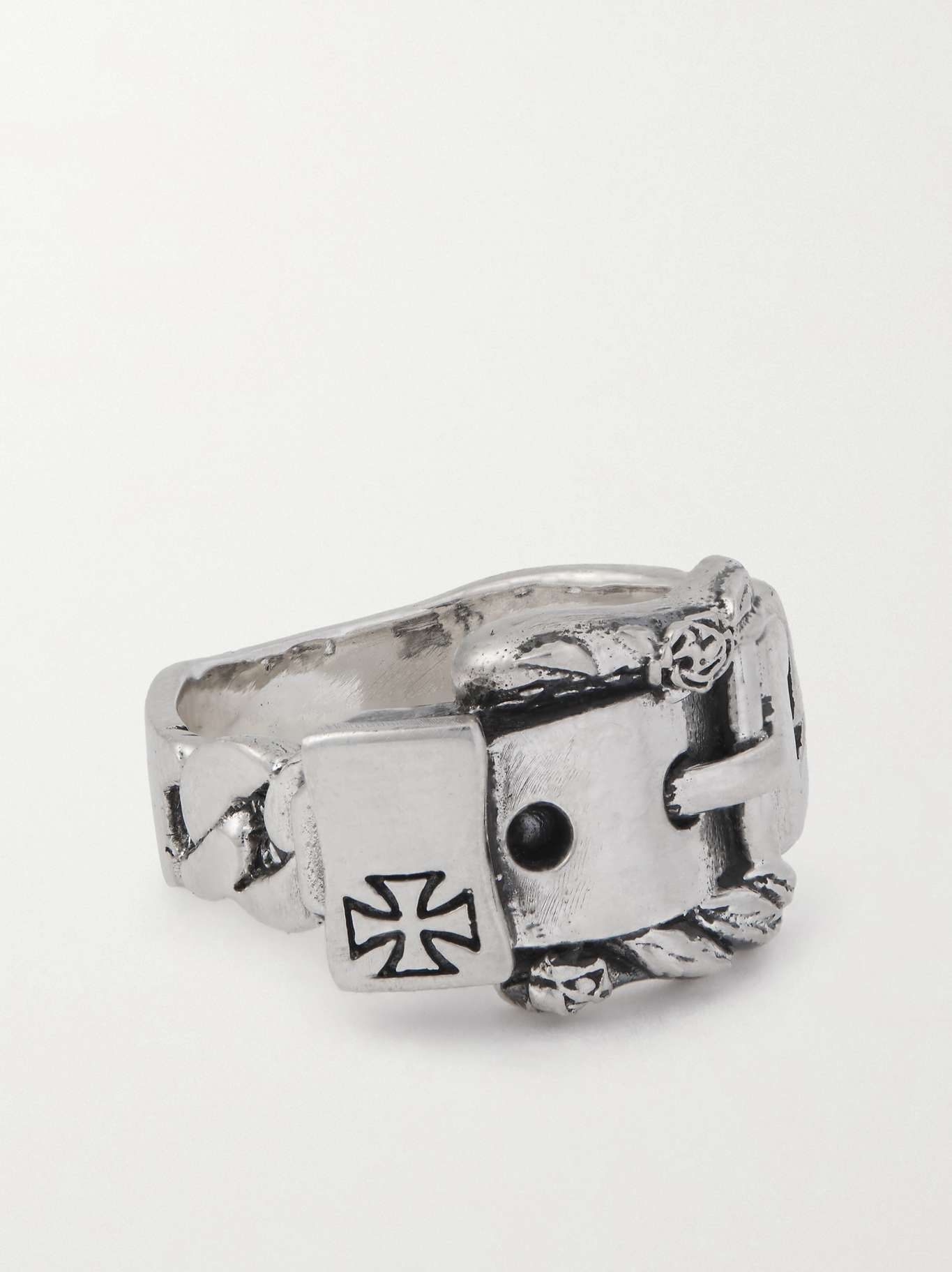 Punk culture keeps Enfants Riches Déprimés freshly inspired. Engraved to look like a 'Buckle', this ring is cast from antiqued sterling silver and features the label's signature roses and cross logo.