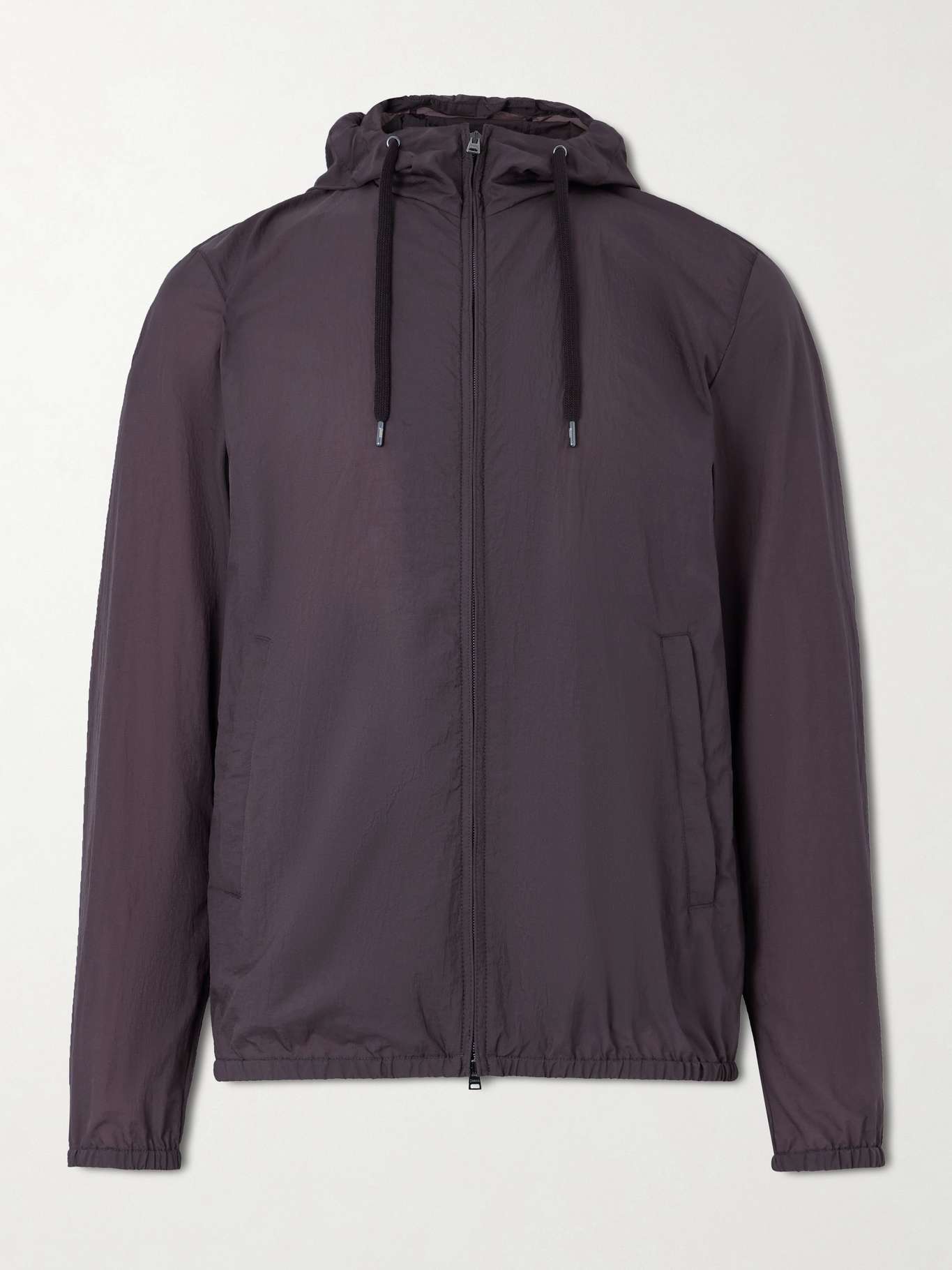 Herno’s hooded jacket is made from lightweight shell fabric with a double-zip fastening for adaptable coverage. The streamlined silhouette and considered tailoring combine to balance ease of movement with a clean profile, making it a practical layer for transitional weather.