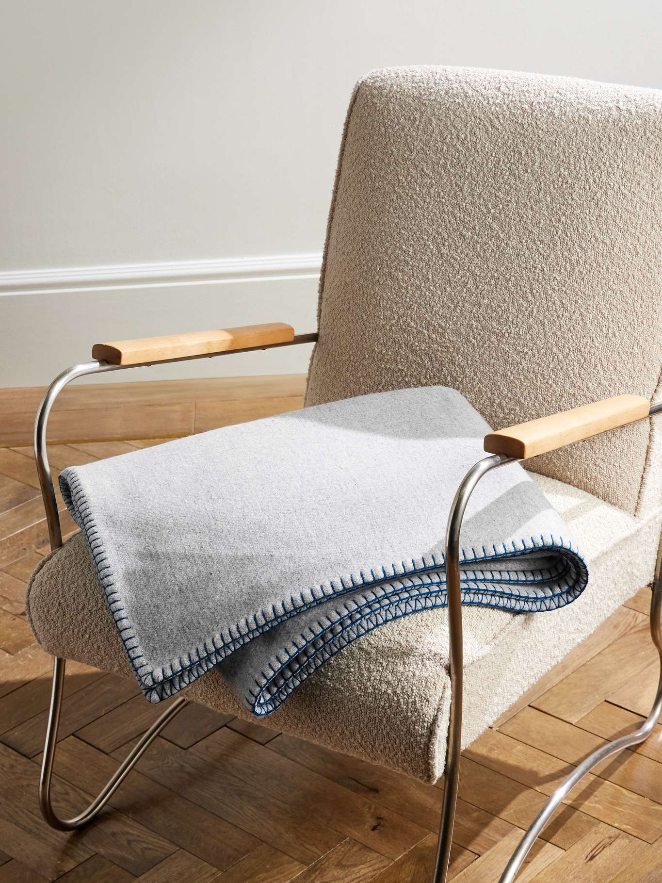 You'll reach for Johnstons of Elgin's blanket often when cooler weather and cosy nights set in. Knitted at the brand's historic Maker's Croft mill, it's made from merino wool blended with a hint of cashmere for added softness and traced with embroidered topstitching in contrast threads.
