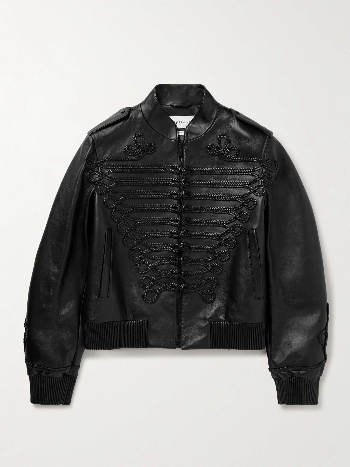 McQueen's bomber jacket is appliquéd with decorative braiding inspired by the traditional frogging on military styles. It's made from supple leather and has epaulettes and ribbed trims.