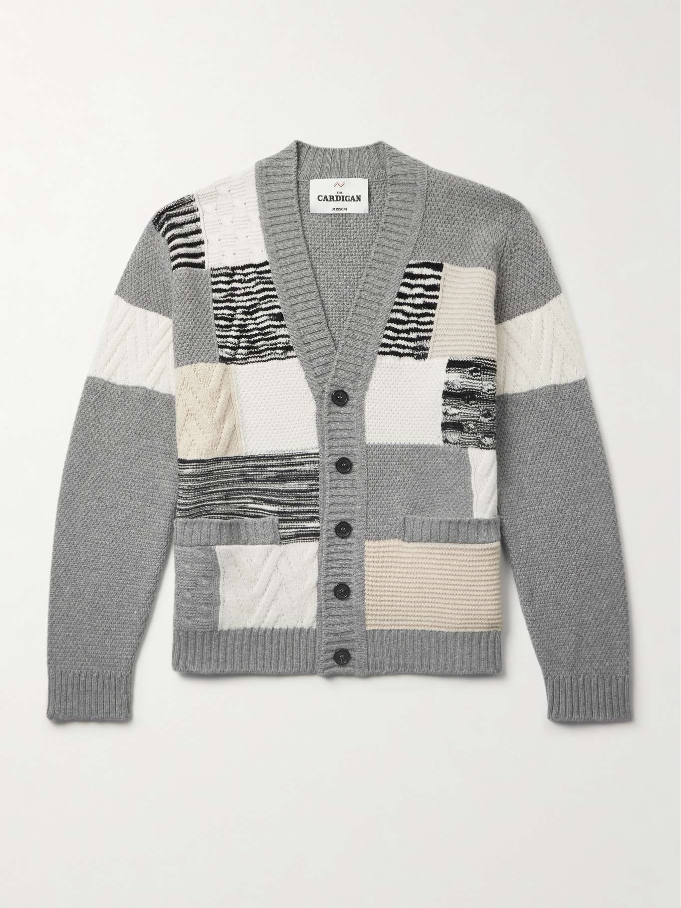 Missoni's cardigan is knitted using a variety of stitches to create a patchwork effect. It's been made in Italy from wool with cable and ribbed sections, space-dyed threads and the house's signature zigzags.