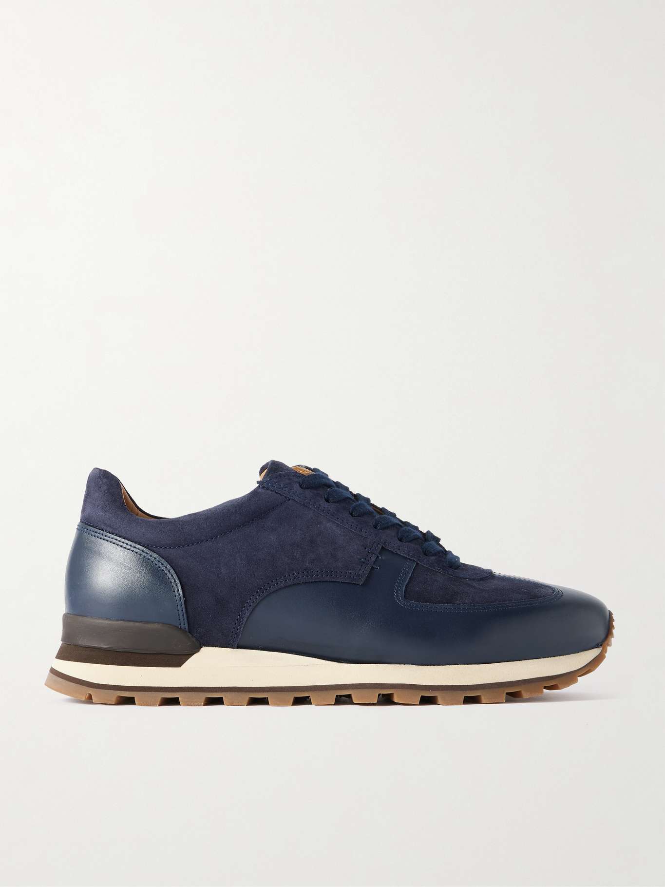 DESIGNED BY MR PORTER. Mr P.'s 'Carlos' sneakers are inspired by runners from the 1970s. Set on retro gum rubber soles, they're made from panels of navy leather and suede and have tonal topstitching.