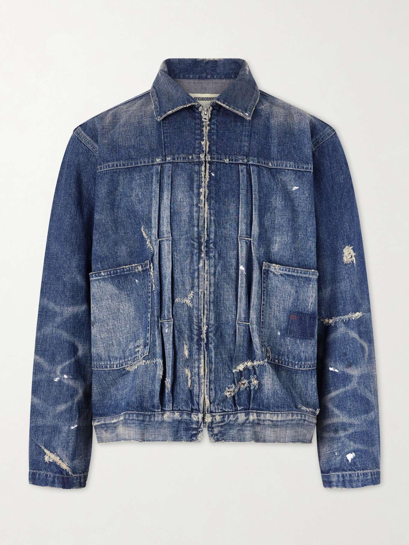 Neighborhood’s denim jacket is cut from mid-weight denim in a boxy, workwear-inspired silhouette. Washed for a heavily worn-in look, it features pronounced fading, faux stains and distressed details. Patch pockets and front pleats add structure, while the zip fastening lends a modern, utilitarian edge.