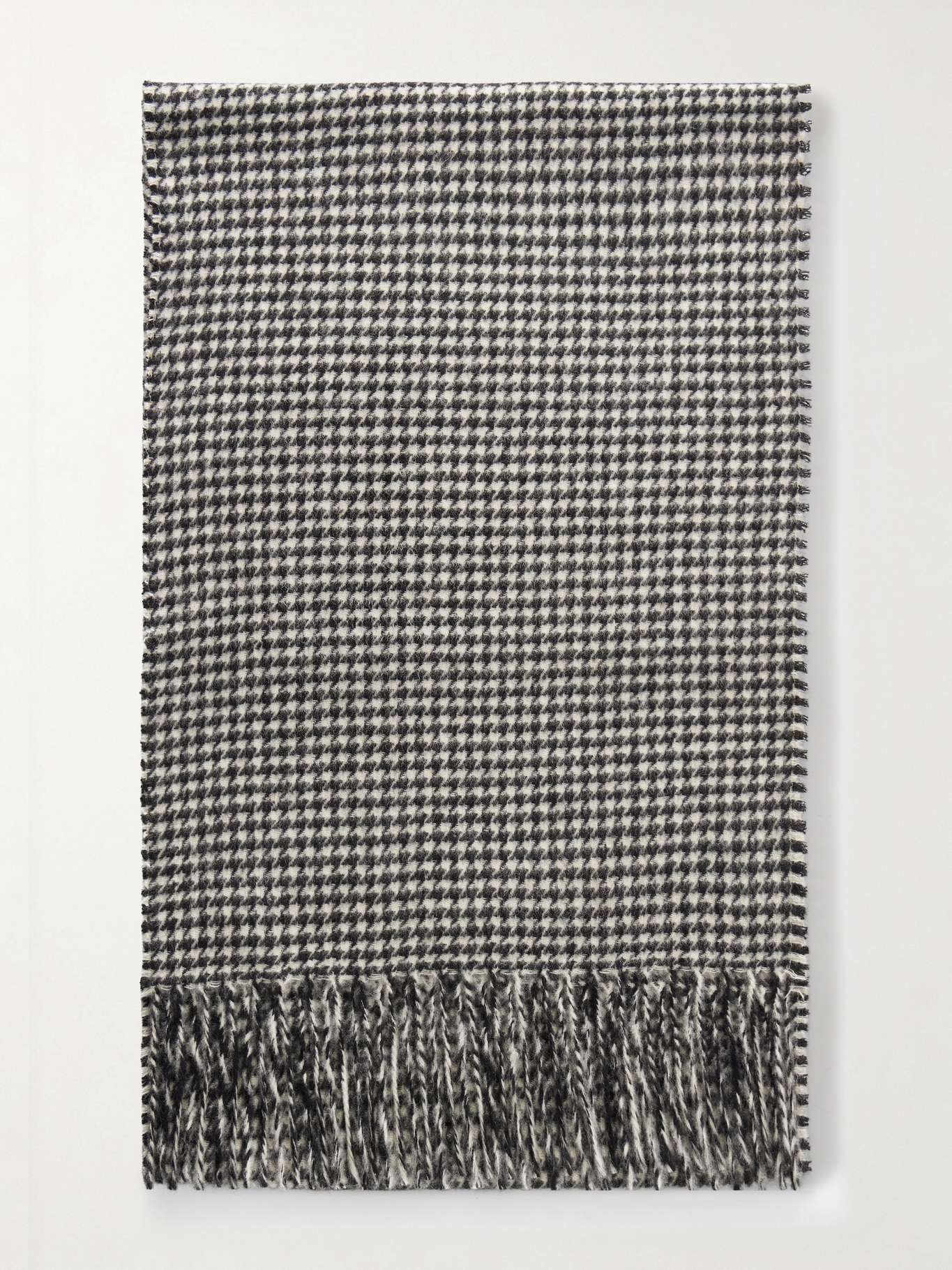 Nili Lotan's houndstooth scarf is made from cashmere, prized for its softness and heat retention. It has a classic fringed design that works with smart tailoring and relaxed denim.