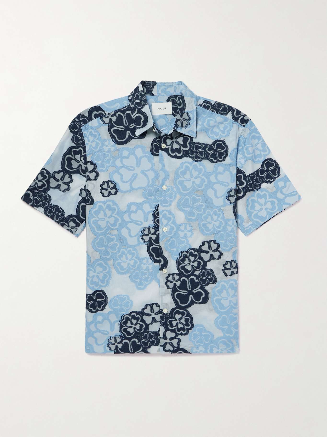 "NN07 has spent the past 18 years proving that your day-to-day clothing doesn't have to be boring," writes The Journal. This 'Freddy 50075' shirt is cut for a boxy fit from fil coupé voile that's woven with tonal-blue flowers – a nod to traditional Hawaiian styles.