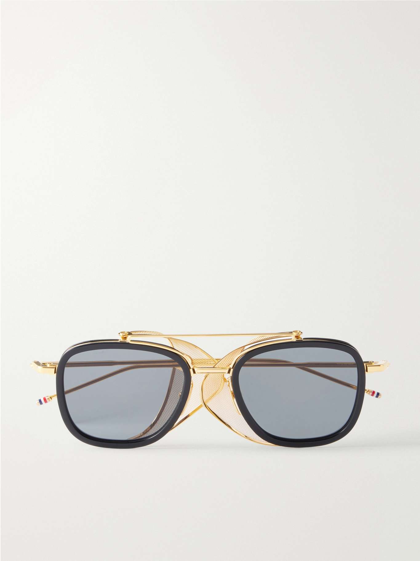 Thom Browne's sunglasses are crafted from acetate with silver-tone titanium, giving them a lightweight feel with a precise, structured finish. The rectangular frames keep the profile sharp, while the construction balances durability with a clean, considered look.