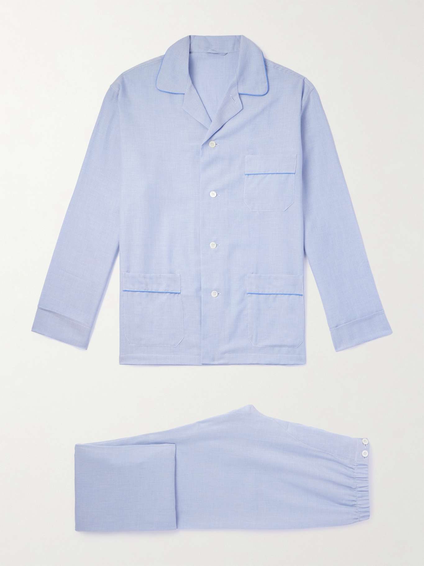 Thom Sweeney's pyjama set has been made in Italy from cotton-twill that's brushed to enhance the soft handle. The top is neatly trimmed with blue piping and the trousers have a comfortable elasticated waistband.