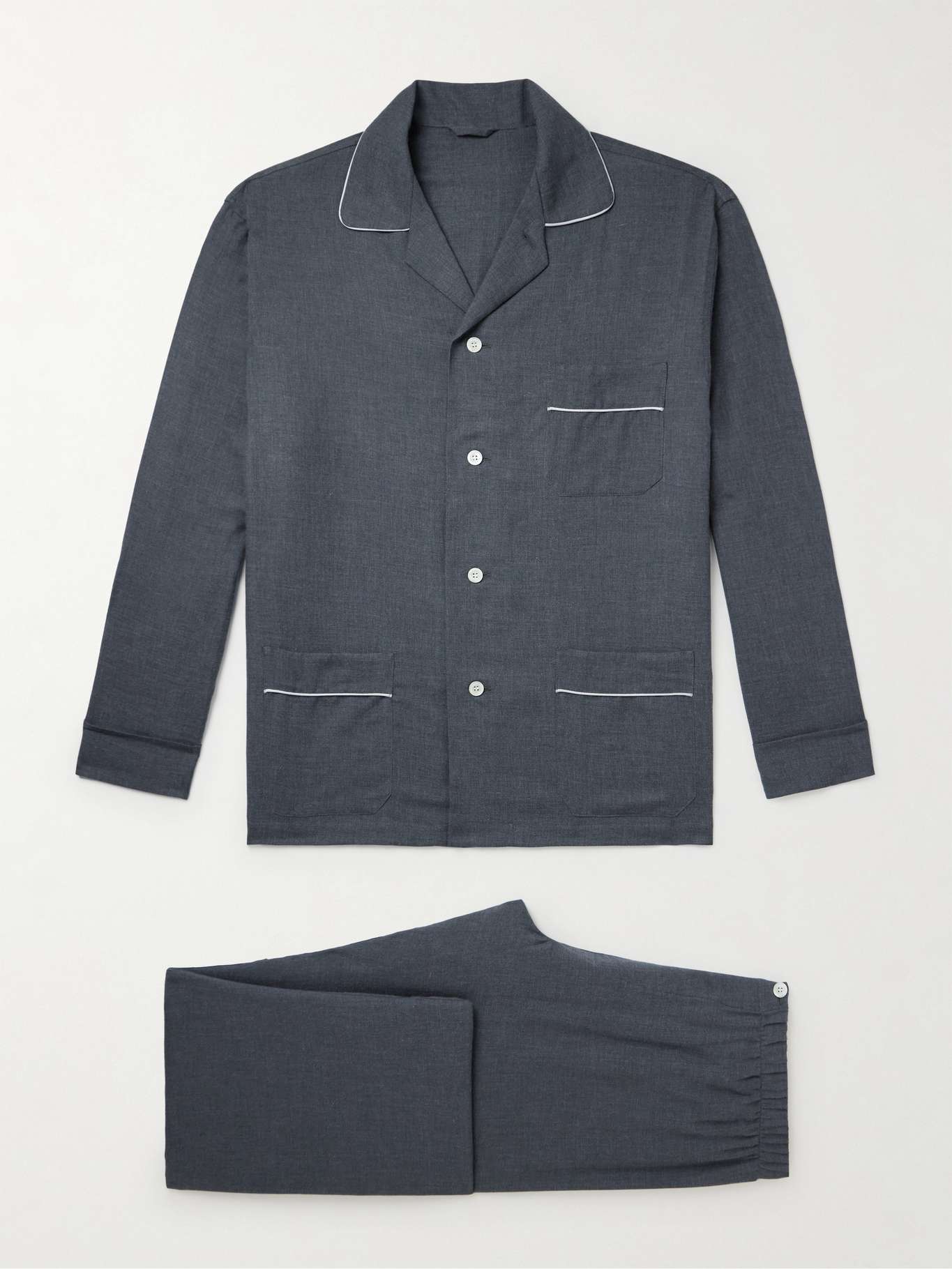Thom Sweeney's pyjama set has been made in Italy from cotton-twill that's brushed to enhance the soft handle. The top is neatly trimmed with white piping and the trousers have a comfortable elasticated waistband.