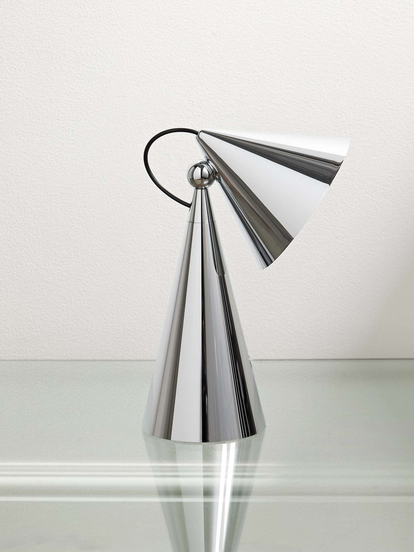 Tom Dixon's 'Pose Portable' lamp evokes mid-century design and futurism with clean, sculptural lines. It's made from polished silver-tone ABS and houses a 3-step touch-dimmable LED ring light. The wireless design keeps it minimalistic and easy to move around.