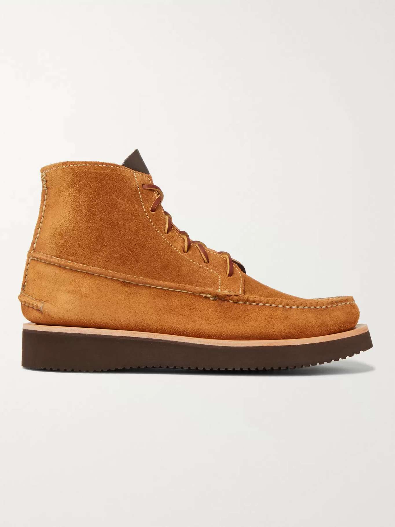 Yuketen's rugged boots are inspired by the close-fitting, pliable shoes worn by the early wilderness guides of New England. The classic, true-moccasin construction delivers the insulation, comfort and silent tread that explorers and indigenous hunters required, and the oil-resistant Vibram® soles provide a solid, steady footing. Shown here with Chimala jeans, visvim jacket, KAPITAL T-shirt.